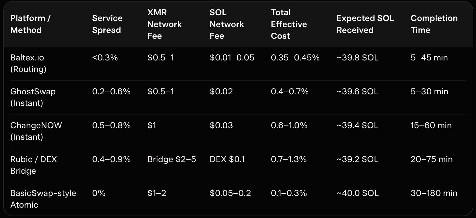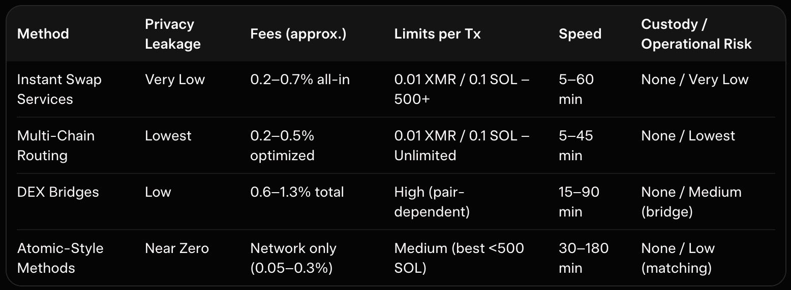 Table 2: Fees and Limits Breakdown (10 XMR → SOL Example, Low Congestion)