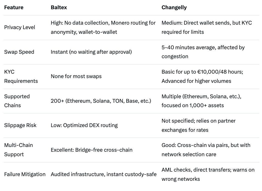 In a landscape where regulatory scrutiny is increasing, privacy remains a key concern for many users. Baltex positions itself as a privacy-centric alternative, routing swaps through mechanisms like Monero to break transaction links, while Changelly balances privacy with compliance through tiered KYC. Speed is another differentiator: Baltex delivers near-instant swaps, ideal for fast-moving markets, whereas Changelly's process, though reliable, involves waiting periods due to blockchain confirmations. Fees on both are competitive, but spreads and slippage can vary based on market conditions and routing methods. Limits are generous, but Changelly ties them to verification levels, potentially slowing down high-volume traders. Supported chains and assets are extensive on both, covering major networks like Ethereum and Solana, but Baltex's 200+ chain support edges out for truly multi-chain environments. Failure scenarios, such as network congestion or user errors, are mitigated through safety protocols, but awareness is crucial. By the end of this guide, you'll have a clear picture to optimize your swaps for cost, speed, and security.