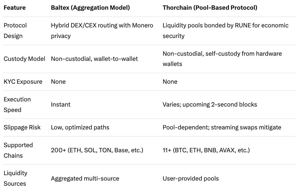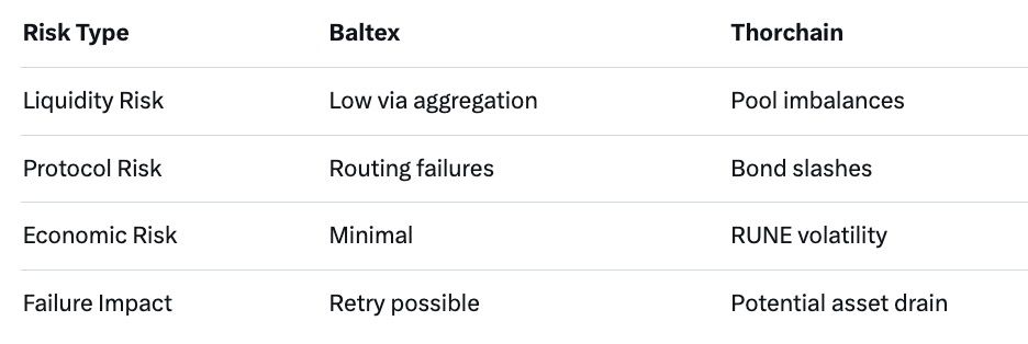 Baltex's multi-source approach reduces risks for diverse trades; Thorchain's bonded pools offer verifiable depth but ecosystem-specific vulnerabilities.