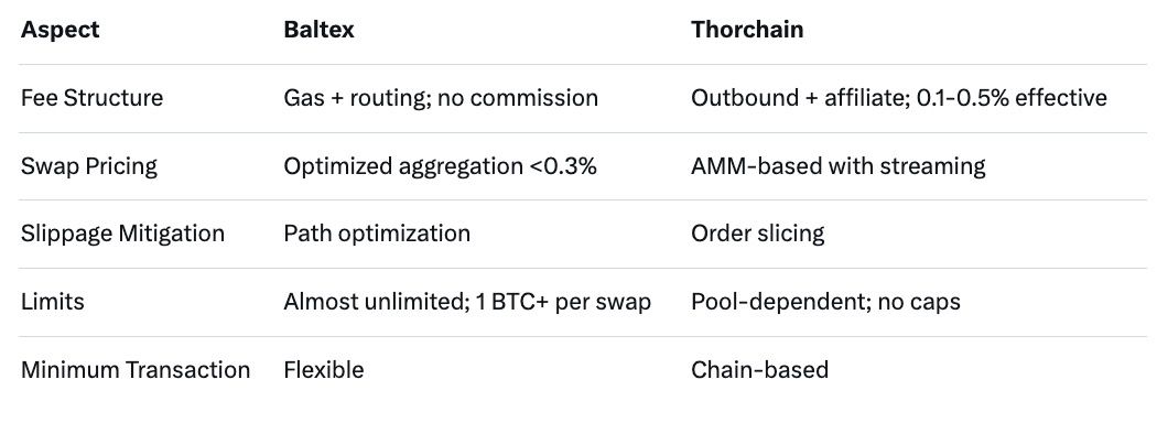 Baltex's aggregation often yields lower effective fees for exotic crosses by sourcing best liquidity, while Thorchain's pool fees provide consistency in supported ecosystems but can escalate during imbalances.
