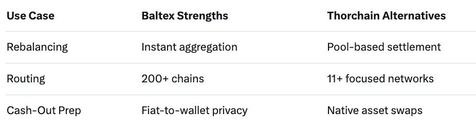 Baltex's breadth suits multi-ecosystem users; Thorchain's focuses on key networks.