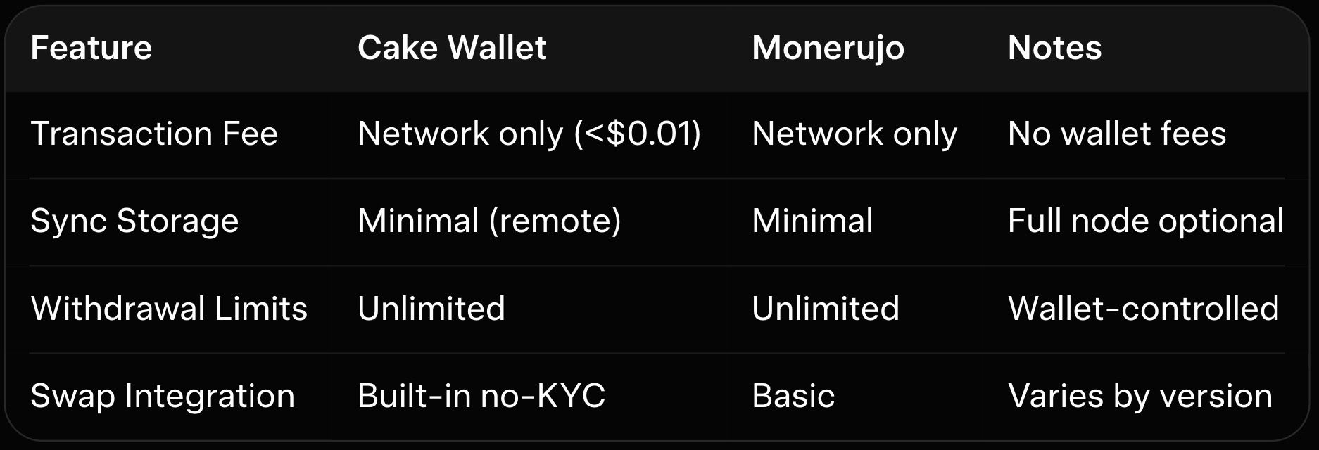 Synchronization speed is a key differentiator. Cake Wallet offers fast remote node sync (minutes on first launch, seconds on subsequent opens) and a clean, intuitive interface that works well on both iOS and Android. Monerujo is particularly strong on Android, with lightweight design and options for pruned or remote nodes. Both wallets support subaddresses for better privacy and have built-in address book features. Usability is high for beginners, with clear send/receive flows and optional fiat price display. Trade-offs include occasional remote node downtime (mitigated by multiple fallback servers) and higher battery usage during sync. As explained in our how-to-make-a-crypto-wallet-simple-user-guide, these wallets make Monero accessible on mobile without sacrificing core security.