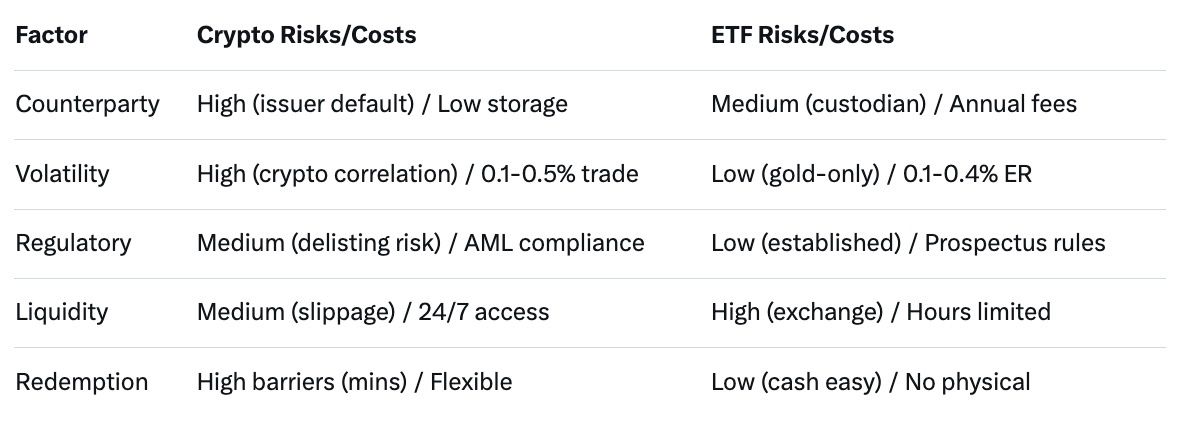 What risks are higher in gold-backed crypto? Issuer counterparty and blockchain vulnerabilities vs. ETFs' custodian risks.