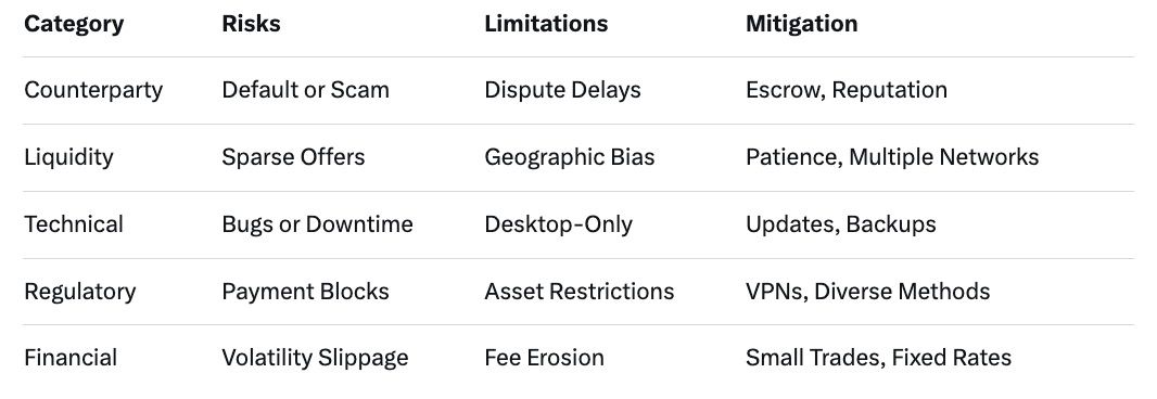 While Haveno minimizes many risks through decentralization, challenges persist. Counterparty risks arise if peers default, though escrow and arbitrators recover funds in most cases. Scams, like fake payments, are possible but rare due to evidence requirements. Liquidity limitations in low-volume pairs delay trades, and volatility can shift values mid-process. Regulatory risks loom; while resilient, users in banned jurisdictions face indirect hurdles like payment blocks.