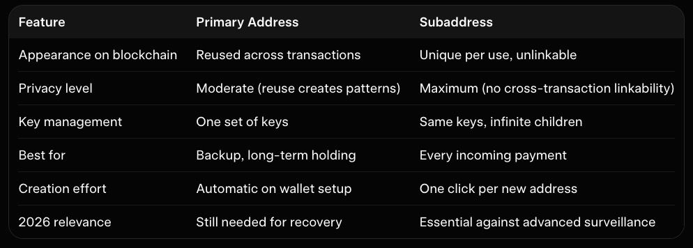 The table above shows why privacy-conscious users treat the primary address like a vault key and subaddresses like disposable deposit slips. Reusing the primary address is the fastest way to create a permanent fingerprint. Subaddresses erase that fingerprint instantly.