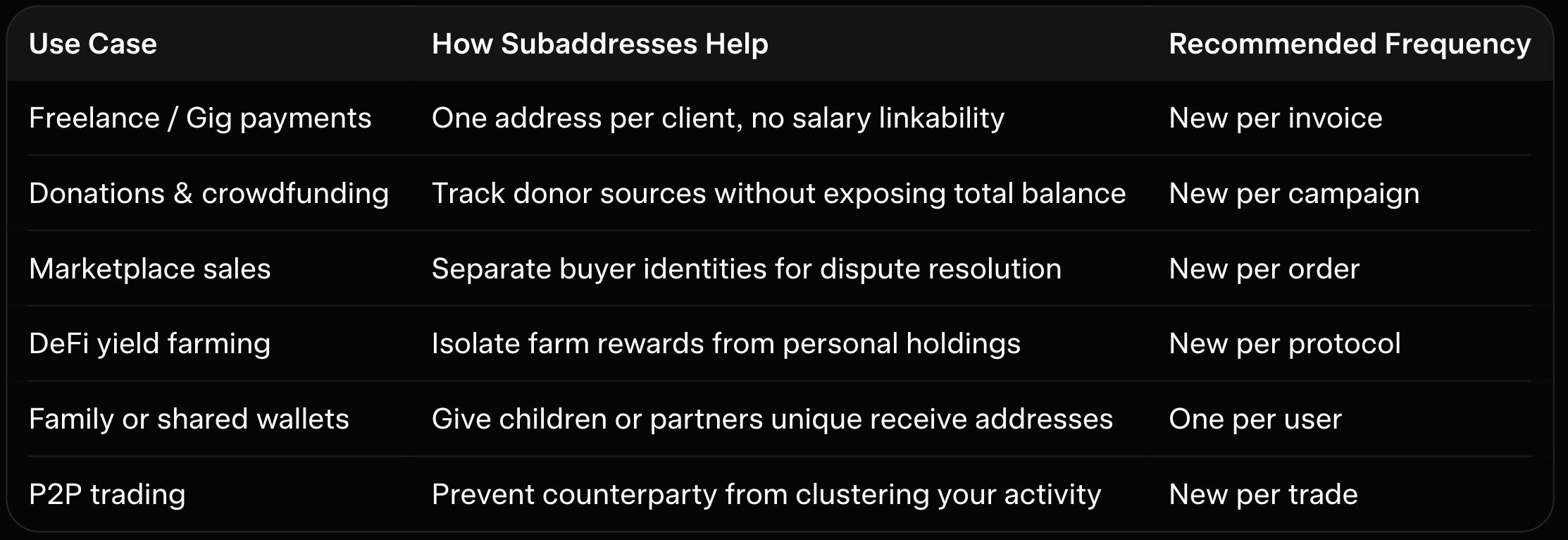 These scenarios show subaddresses turning Monero from “private by default” into “private by design.” Each use case reduces metadata leakage that even ring signatures cannot eliminate alone.