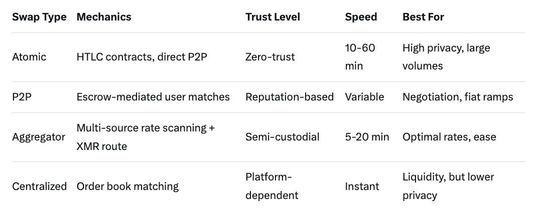Monero swappers come in varied forms, each suited to different privacy needs. Atomic swaps, using HTLCs, offer pure decentralization with no intermediaries, ideal for direct BTC-XMR but limited to supported pairs and slower (10-60 minutes). They shine in trustlessness, requiring only wallet software.