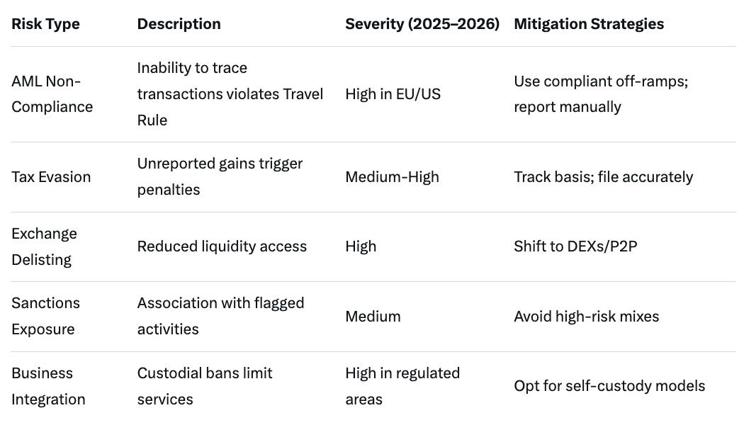 In 2025–2026, risks include blacklisting of associated addresses by analytics firms, complicating integrations. However, self-custodial use mitigates some issues, provided users adhere to local reporting.