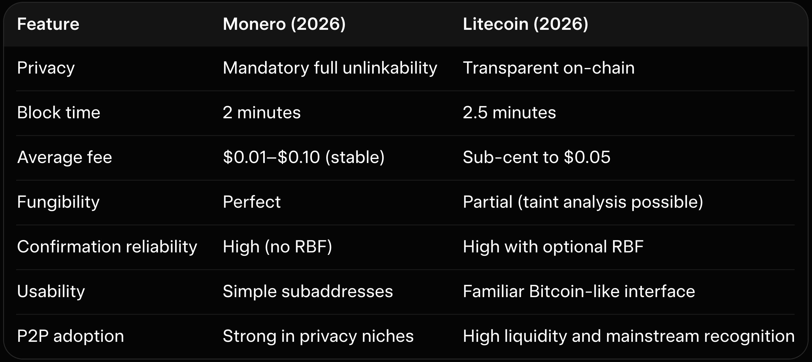 The table highlights the core trade-offs P2P users face daily. Monero protects every payment automatically. Litecoin feels like a faster, cheaper version of Bitcoin for those who do not need privacy.