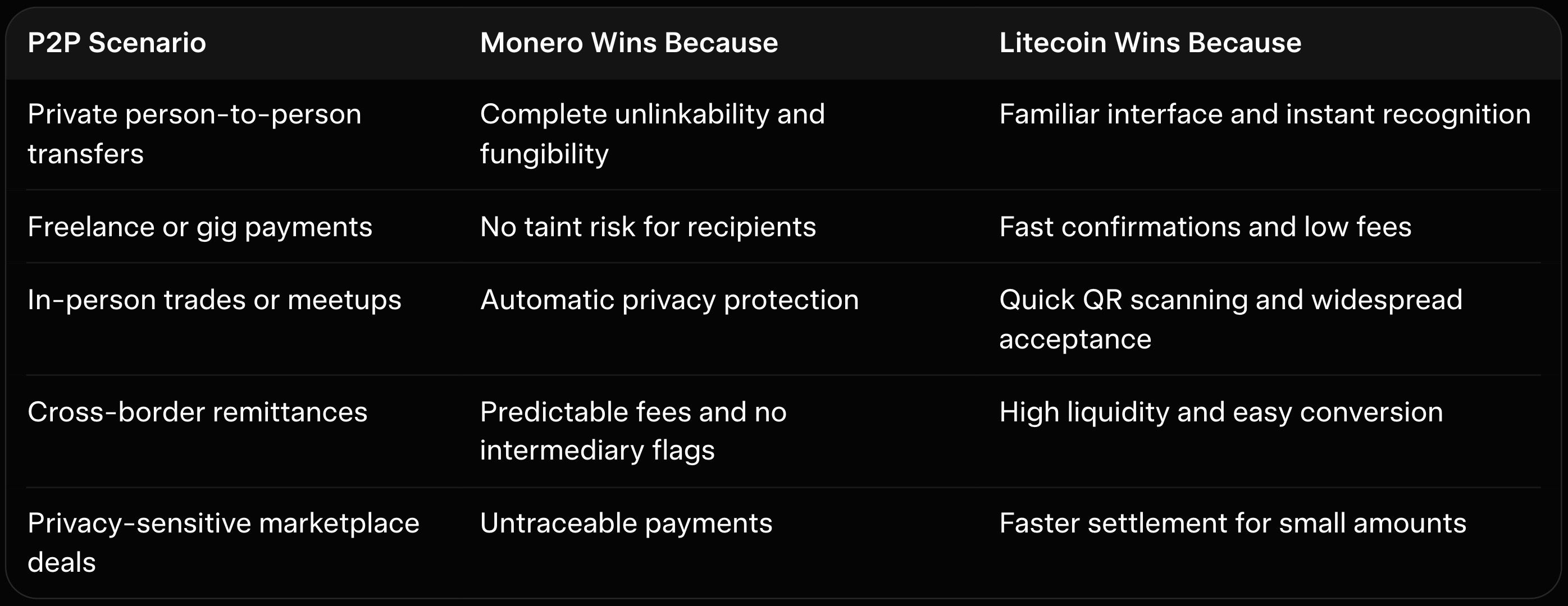 This table shows where each coin shines in actual peer-to-peer situations. Monero protects sensitive or high-value P2P deals. Litecoin powers casual fast transfers where speed and familiarity matter more.