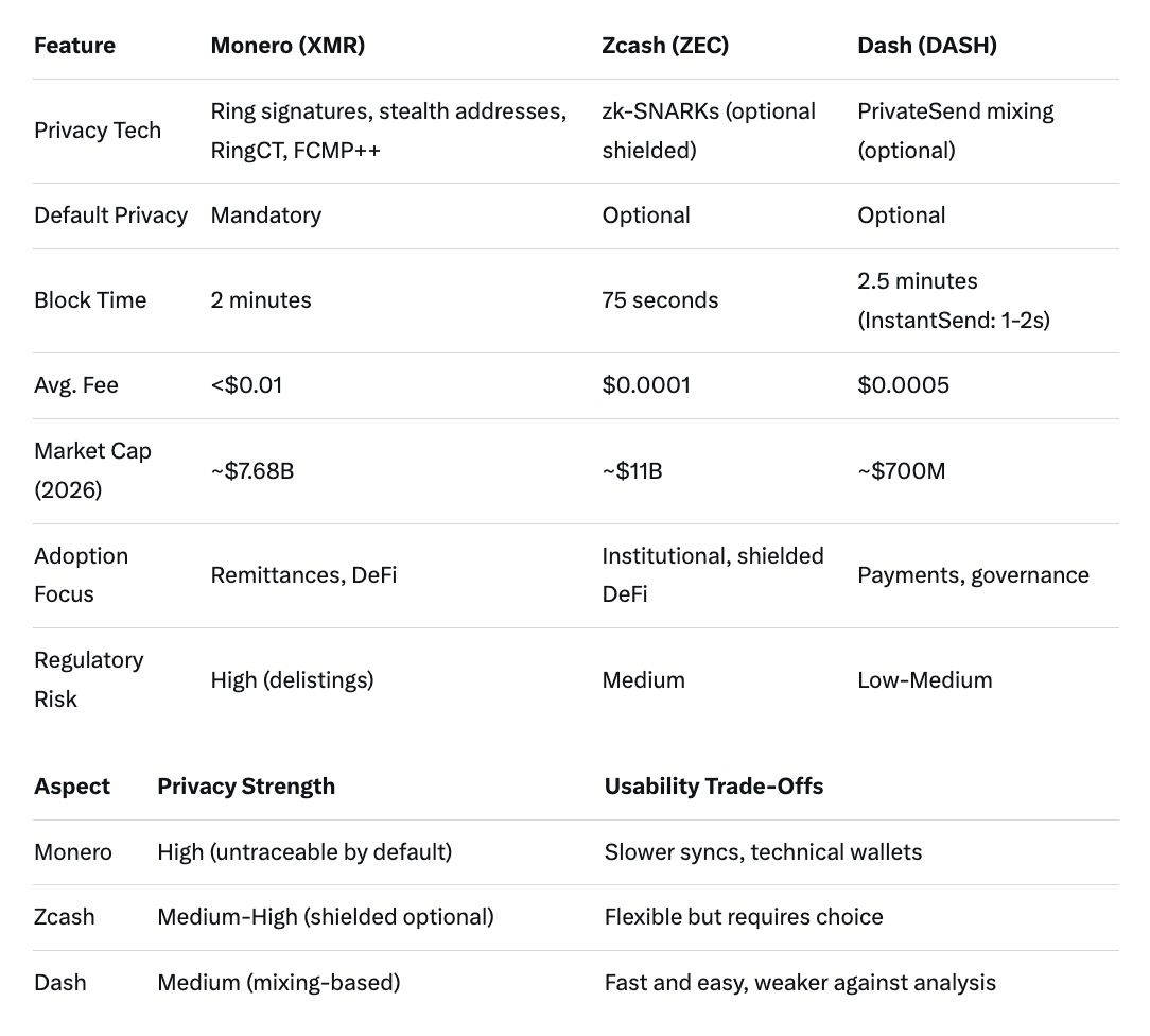 In 2026, Monero leads as the best privacy coin with mandatory anonymity via ring signatures and FCMP++ upgrades, offering unbreakable untraceability at low fees ($0.01) but facing delistings. Zcash provides optional zk-SNARKs privacy with institutional appeal and faster speeds, though adoption lags due to optional features. Dash excels in usability with quick transactions (1-2 seconds) and governance, but its mixing-based privacy is weaker against analysis. Choose Monero for ultimate privacy, Zcash for flexibility, Dash for payments—regulatory risks persist across all.