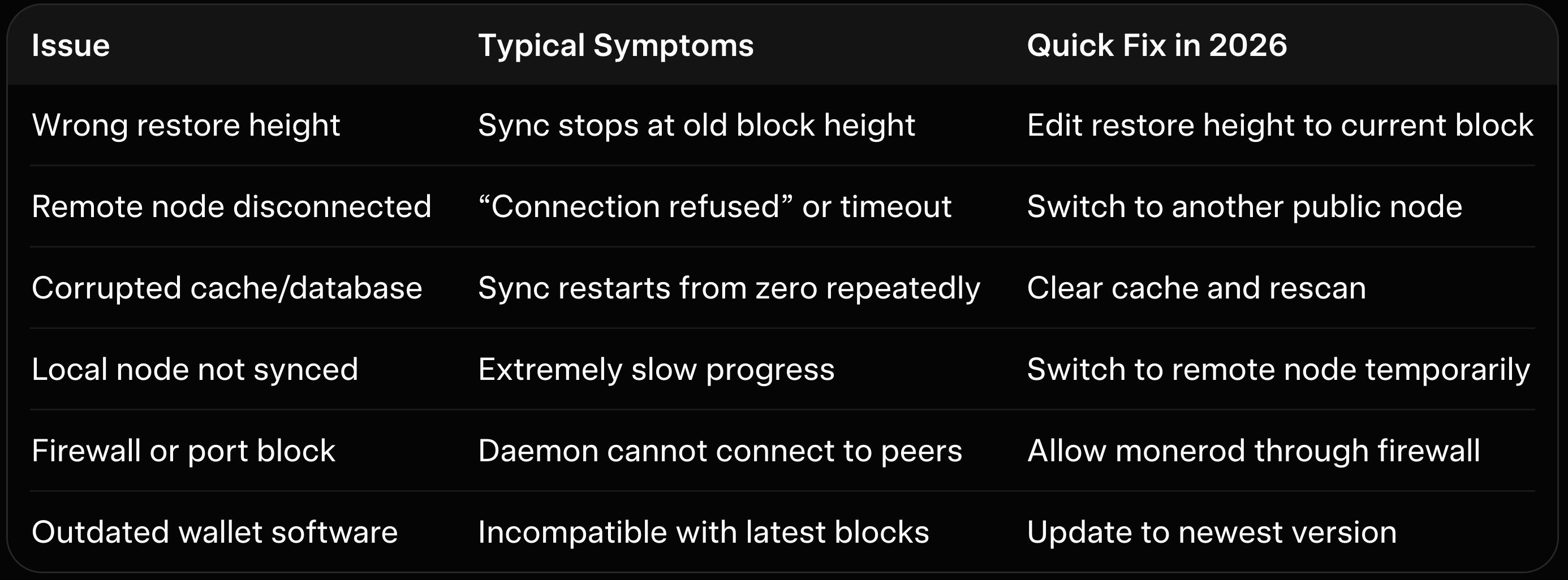 Conclusion Monero wallet sync issues remain a common but easily solvable annoyance in 2026. Armed with the right node choice, cache reset, and correct restore height, most users regain full access within minutes rather than days. The fixes above apply equally to desktop, CLI, and mobile wallets without needing advanced technical skills.