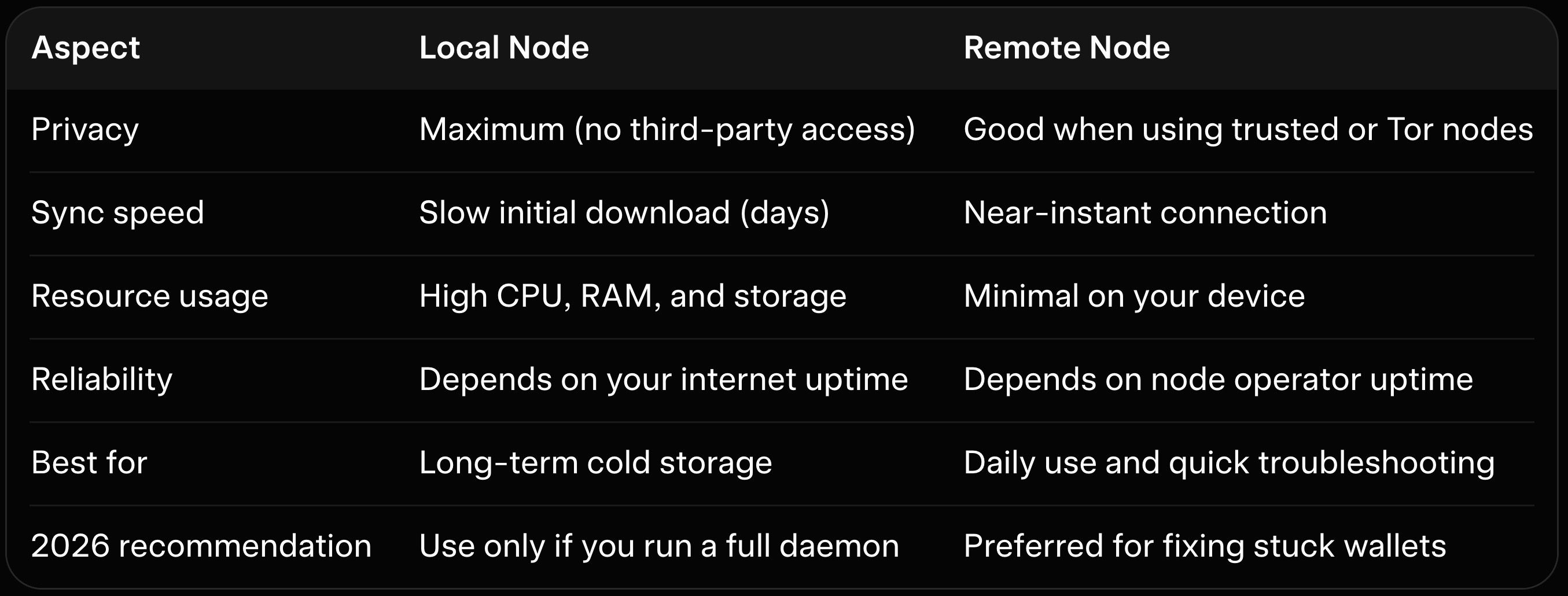 The table makes the choice clear for most users facing sync trouble. Remote nodes solve 80 percent of stuck wallet cases immediately. Local nodes remain ideal once your wallet is fully operational and you want maximum privacy.