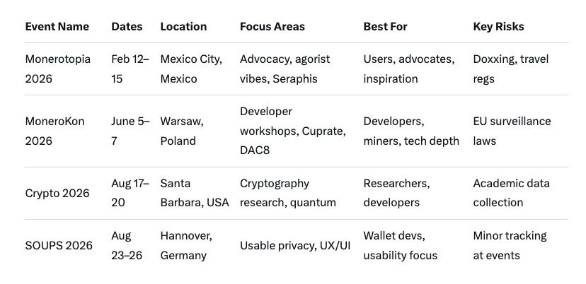 Crypto 2026 (International Cryptology Conference) occurs August 17–20 at UC Santa Barbara. While not XMR-exclusive, it’s where leading cryptographers present peer-reviewed work that underpins Monero’s security. Monero Research Lab contributors often present on next-generation ring signatures and quantum-resistant schemes. Best for developers and researchers wanting to understand the mathematical future of privacy coins. Risks are minimal in an academic setting, but OPSEC still applies—use separate accounts and avoid casual networking that could reveal affiliations.