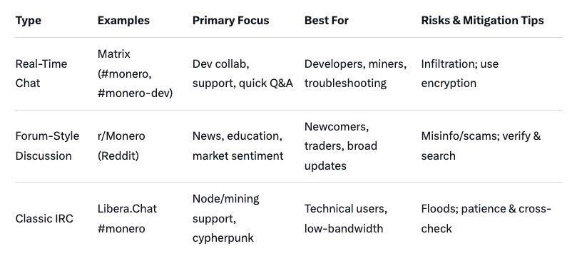 The Monero Matrix Network has become the primary communication rail. Core channel #monero:matrix.org serves general discussion, #monero-dev:matrix.org hosts development talks, and #monero-community:matrix.org focuses on support and outreach. Matrix is bridge-linked to Libera.Chat IRC, ensuring censorship resistance. Best for real-time collaboration—developers discuss Seraphis implementation, miners troubleshoot XMRig configs, and users get wallet help. Risks include infiltration by bad actors—use encrypted clients, pseudonyms, and avoid sharing wallet seeds.