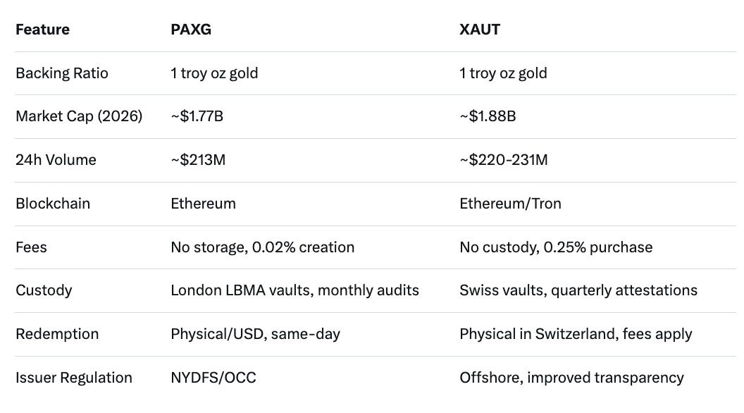 Which has better liquidity in 2026: PAXG or XAUT? XAUT edges out with higher volumes (~$220M vs. $213M) and multi-chain support.