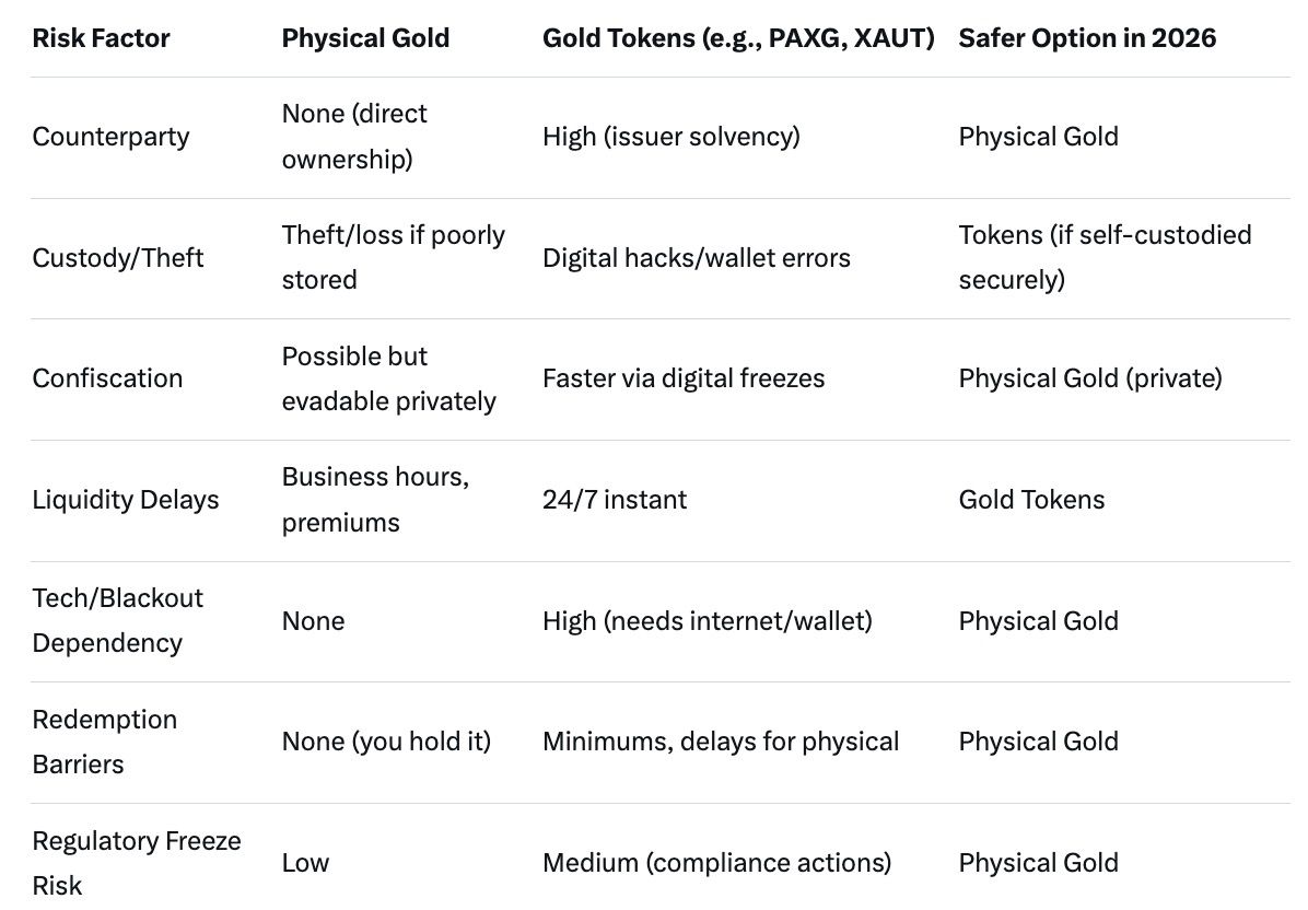 Is physical gold truly confiscation-proof in 2026? Private small holdings often are, but large vaulted amounts face higher risks; tokens can be frozen digitally faster.
