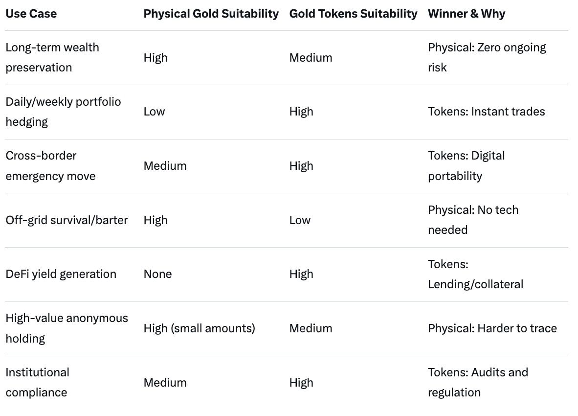 Trade-offs boil down to priorities: Physical gold suits long-term, low-intervention preservation with minimal external dependencies. Tokens favor active investors needing speed, fractional ownership, and DeFi utility, accepting layered risks for enhanced usability.
