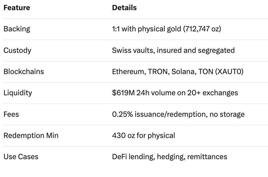 How secure is XAUT's gold backing? Backed by 712,747 ounces in Swiss vaults with quarterly audits, but relies on Tether's management.