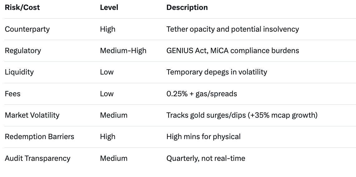 What are the main risks of buying XAUT? Regulatory scrutiny, counterparty from Tether, and potential depegs.