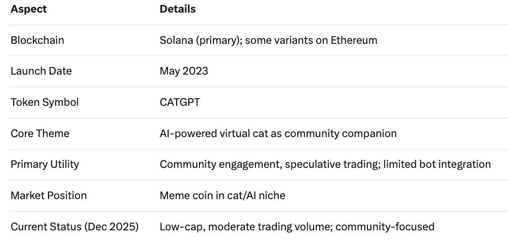 TL;DR: CatGPT (CATGPT) is a community-driven meme coin on the Solana blockchain, blending cat-themed fun with AI inspiration. Launched in 2023, it's positioned as a "virtual AI cat" acting as a community assistant. It's primarily a speculative meme token with limited real utility, typical high risks of volatility and potential rugs, and no strong roadmap or doxxed team. Ideal for meme enthusiasts, but approach with caution—DYOR and only invest what you can afford to lose.
