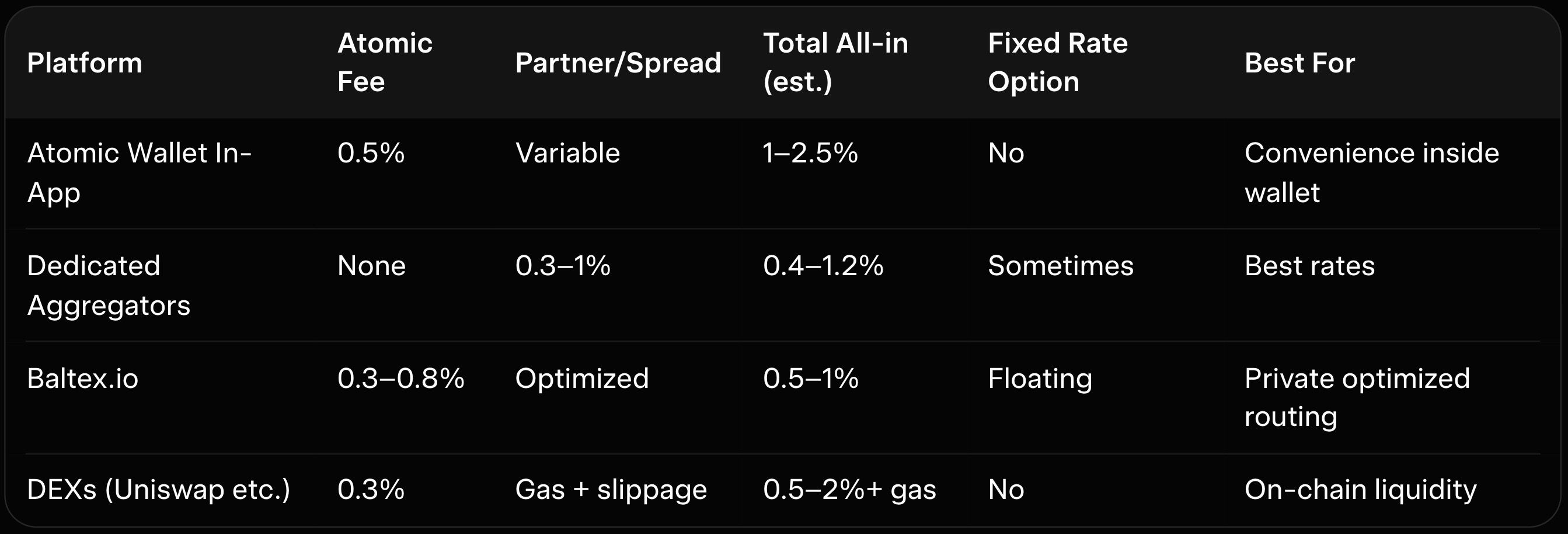 Atomic Wallet’s in-app swaps in 2026 offer convenient non-custodial trading for over 1,000 assets directly inside the wallet, powered by third-party providers like ChangeNOW. Users pay a 0.5% Atomic fee plus partner commissions and spreads, making them pricier than dedicated aggregators for frequent or large trades. Baltex.io improves on this with lower all-in costs, private shielded routing, and better rate optimization while maintaining full wallet-to-wallet non-custodial security.