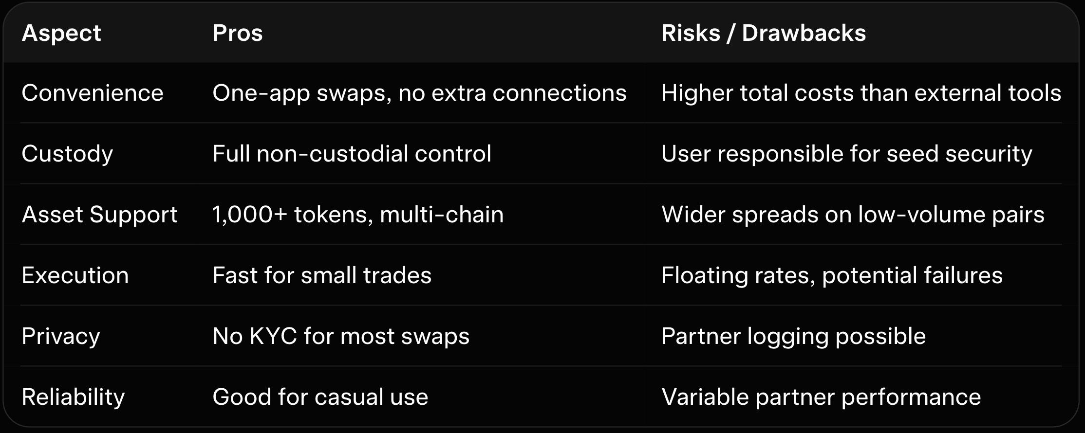 Third-party provider dependency introduces execution and rate risks beyond Atomic’s control. Floating quotes can result in worse outcomes if markets move during processing. Users bear full responsibility for seed phrase security in this non-custodial setup.
