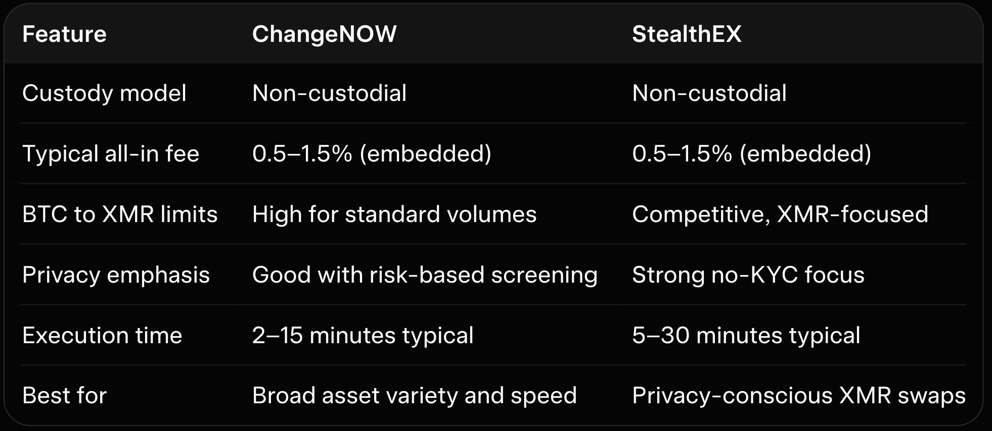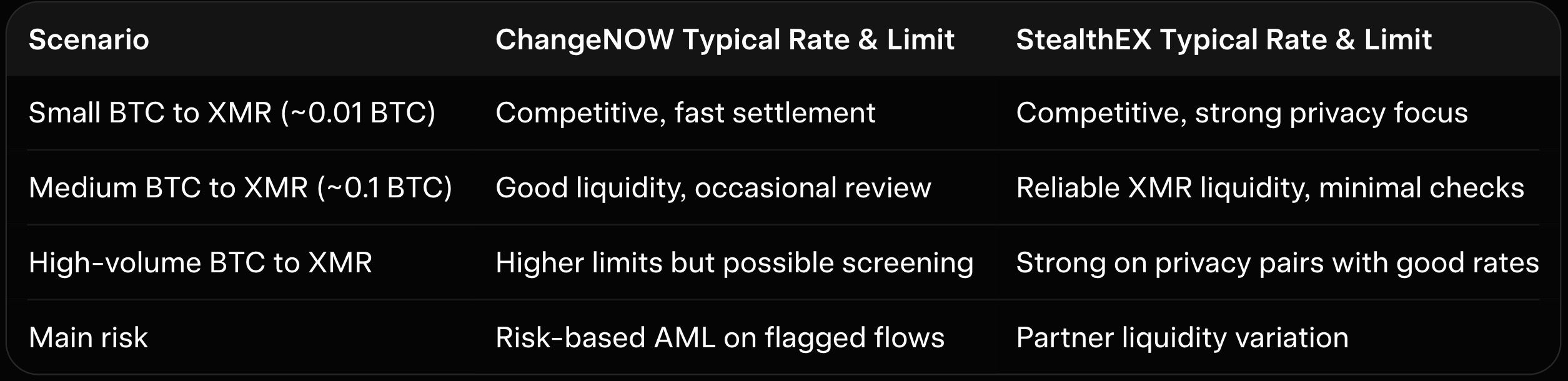 This table uses typical 2026 examples for BTC to XMR swaps. Actual rates fluctuate with market conditions and partner liquidity.