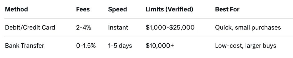 Fees: ~3-4% total. Limits: $1,000+ daily after verification.
