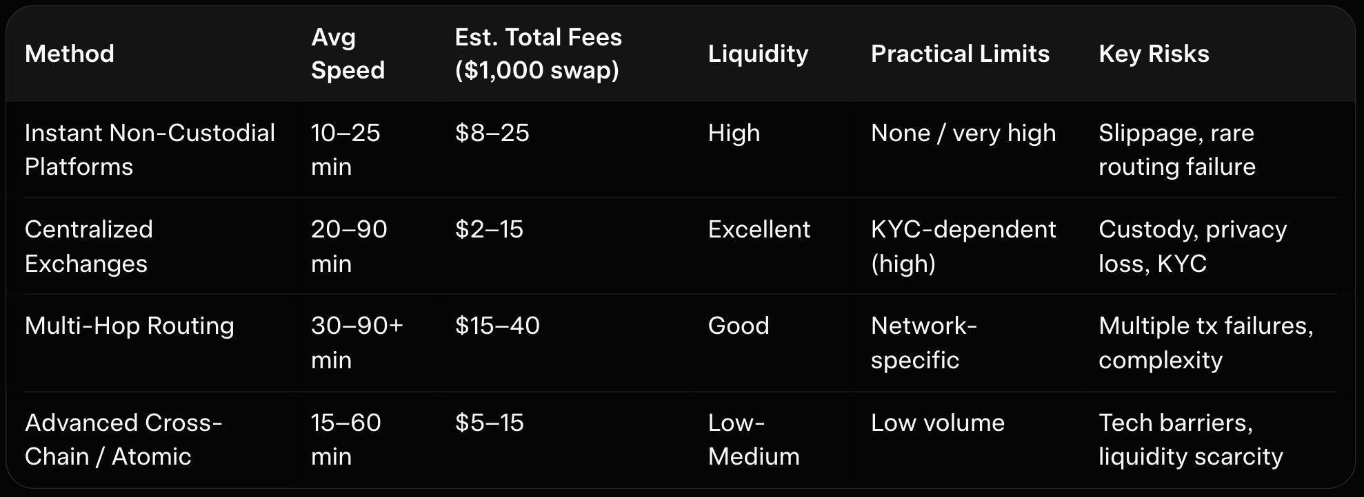These tables illustrate why non-custodial aggregators frequently win for the target audience: they deliver competitive costs without forcing identity disclosure or prolonged custody.