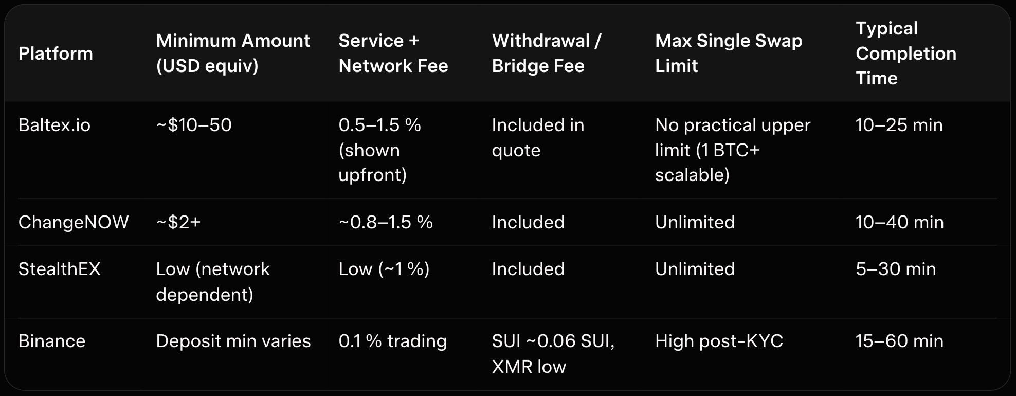 Fees and Limits Comparison Table (SUI → XMR approximate, February 2026)