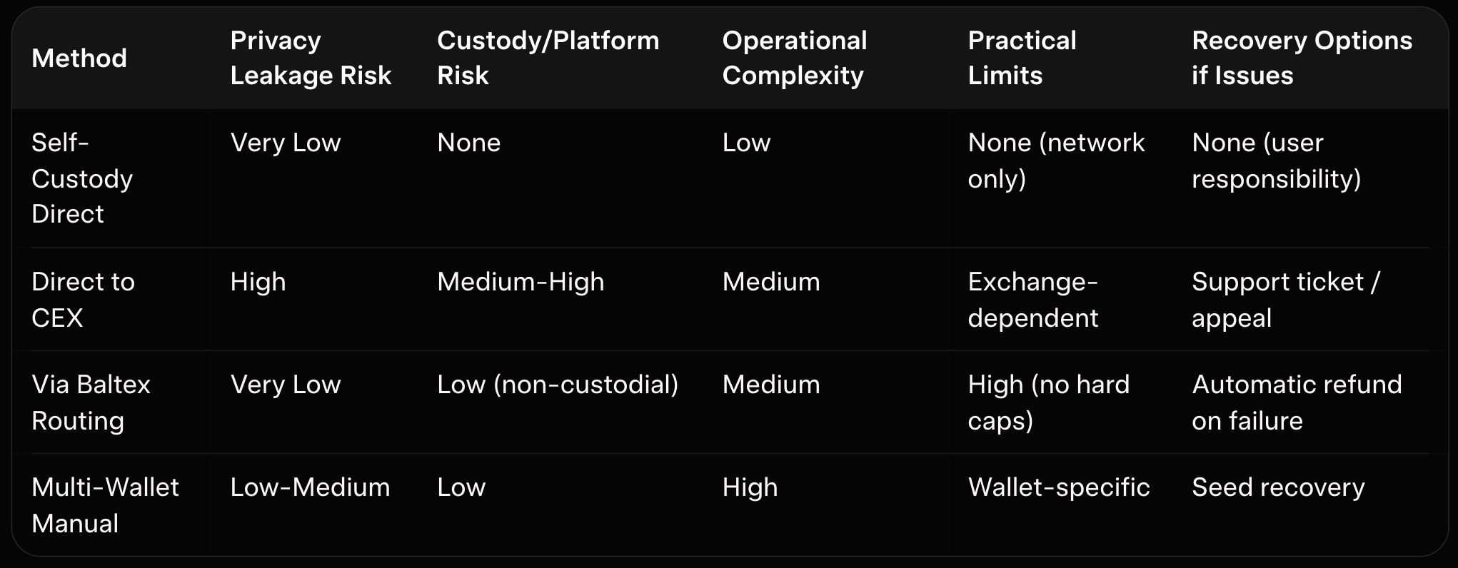 Baltex supports high limits with no practical upper bound for most users, offers live transaction tracking, and maintains 24/7 support without requiring any account or personal data. For users who frequently bridge between private Monero holdings and exchange liquidity, this routed approach has become standard practice: it combines the speed of instant swaps with the privacy guarantees Monero users expect. Many combine it with hardware wallets on both ends, further isolating the flow.