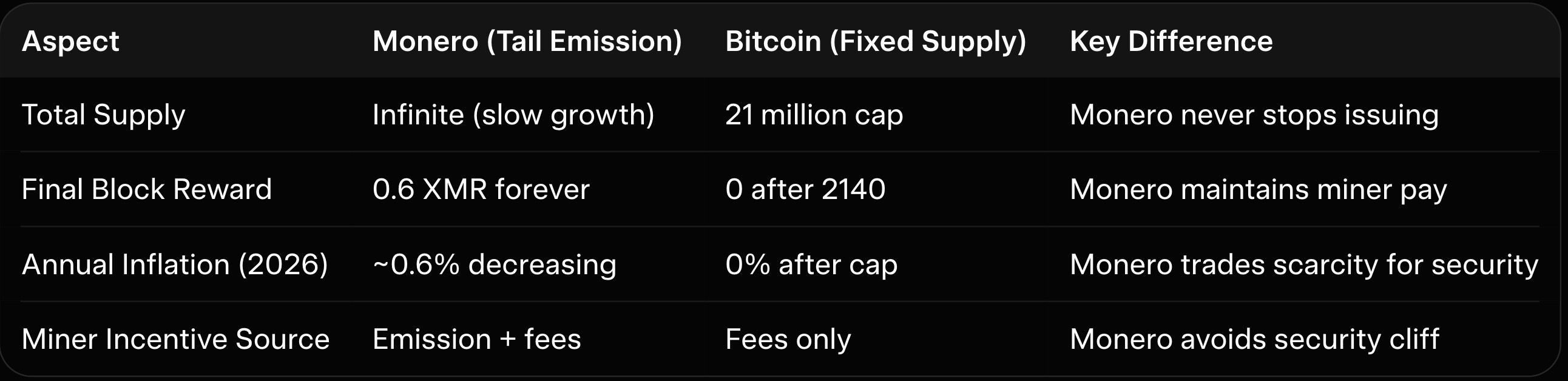 Monero has slow ongoing inflation (0.6 XMR/block); Bitcoin has a hard 21 million cap and eventual zero block rewards.