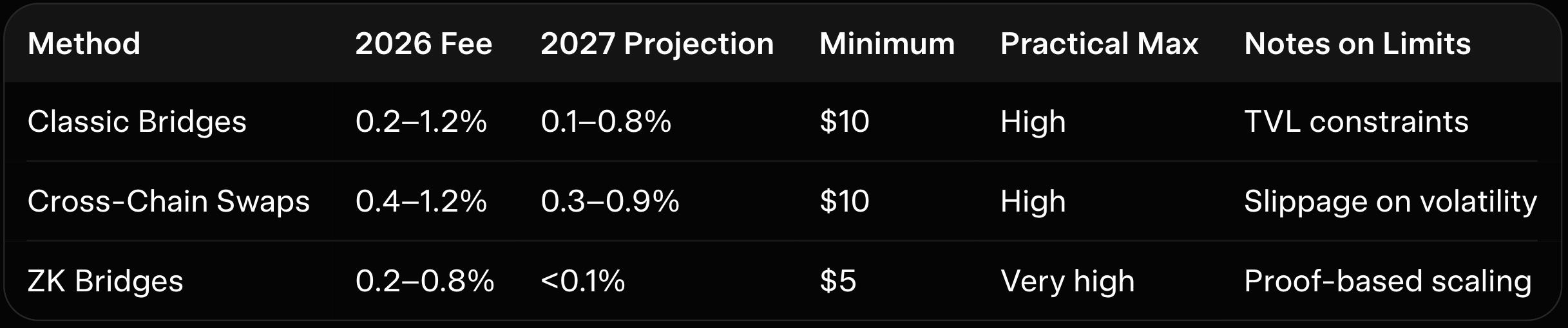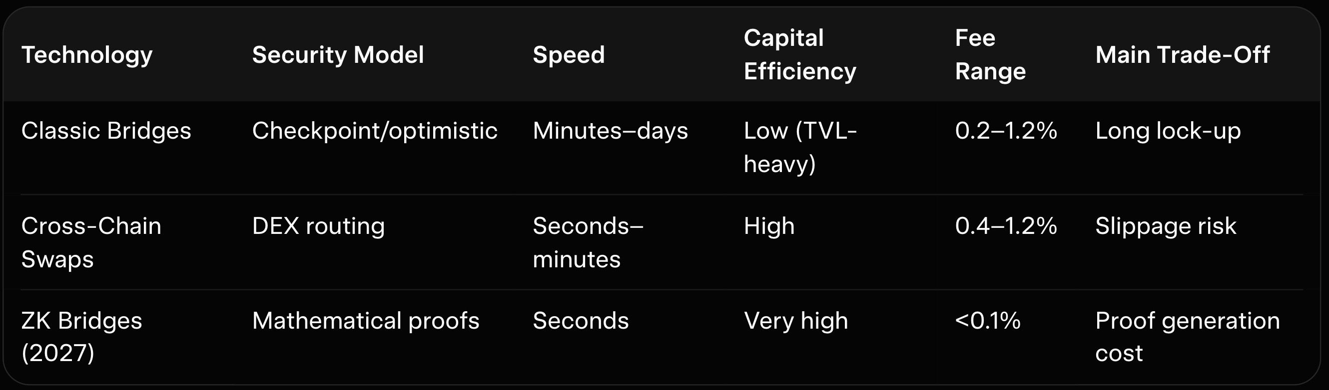 Classic bridges rely on locked liquidity or optimistic verification, creating TVL risks and longer finality. Cross-chain swaps use DEX routing for speed but add slippage and smart-contract exposure. ZK bridges combine the best: native delivery, sub-minute speed, and mathematical security without pools. For large ETH moves, ZK is safer than classic bridges and more efficient than swaps. For frequent stablecoin trades, ZK matches swap speed with better security. As explained in our cross-chain-swaps-swap-crypto-between-blockchains-instantly and best-crypto-bridge-swaps-2025-instant-transfers-low-gas, ZK bridges will become the standard for secure, efficient transfers.