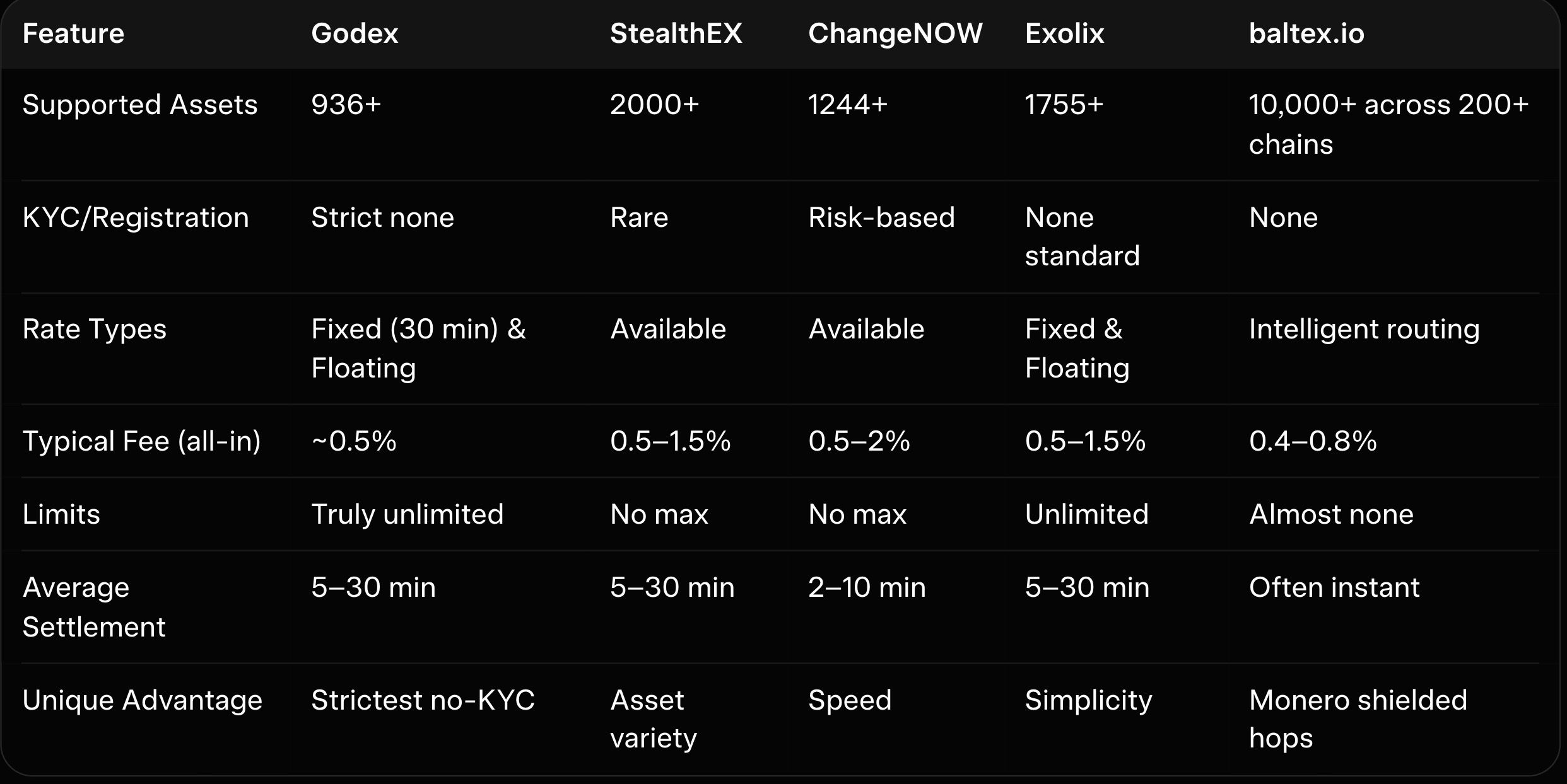 The Private Swap mode can insert shielded Monero hops where needed, fully breaking on-chain links between source and destination addresses via ring signatures and stealth addresses. This built-in privacy enhancement goes far beyond basic unlinkability offered by single-hop services like Godex. Settlements often complete in 8–35 minutes even on complex cross-chain routes, fees stay low at ~0.4–0.8%, and there are virtually no limits. Supporting over 10,000 tokens across 200+ networks without manual bridging, Baltex delivers true one-click execution for users who need speed plus maximum anonymity.