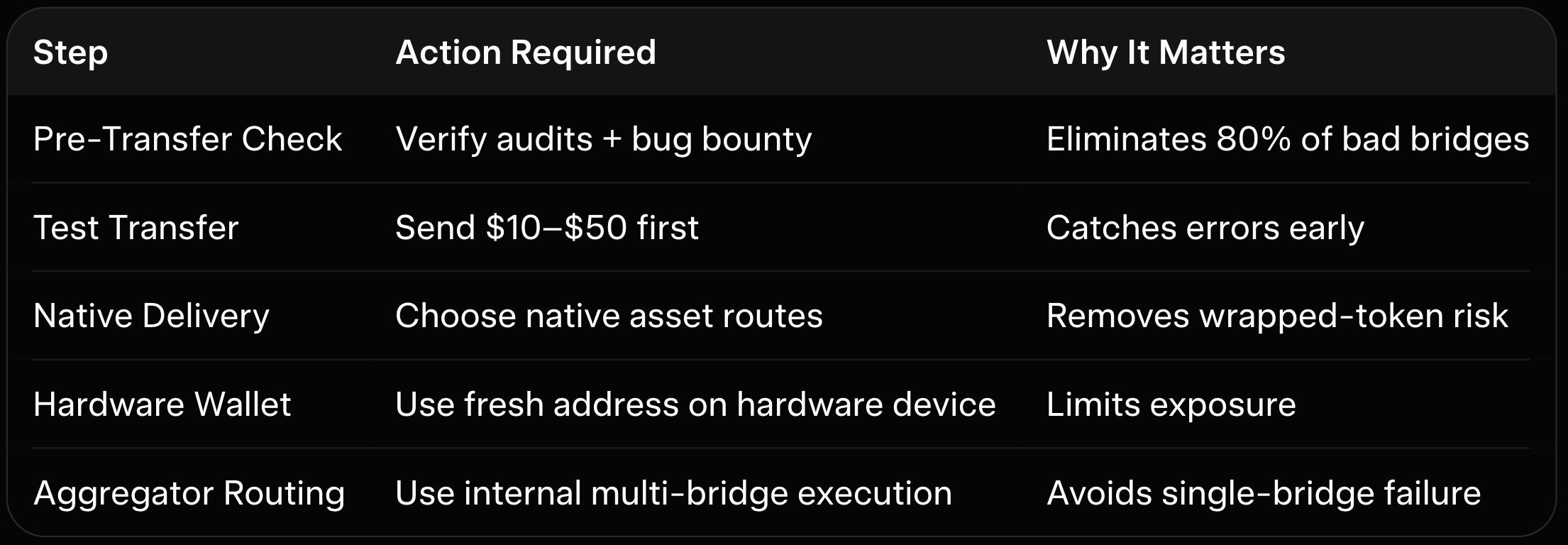 Always choose routes that deliver native assets on the destination chain instead of wrapped versions. Wrapped tokens add extra smart-contract layers and approval steps, increasing exploit surface. Native delivery (common in intent-based and unified-liquidity bridges) removes this risk entirely. For details on why native is safer, see our what-is-crypto-bridge-cross-chain-transfers-guide.