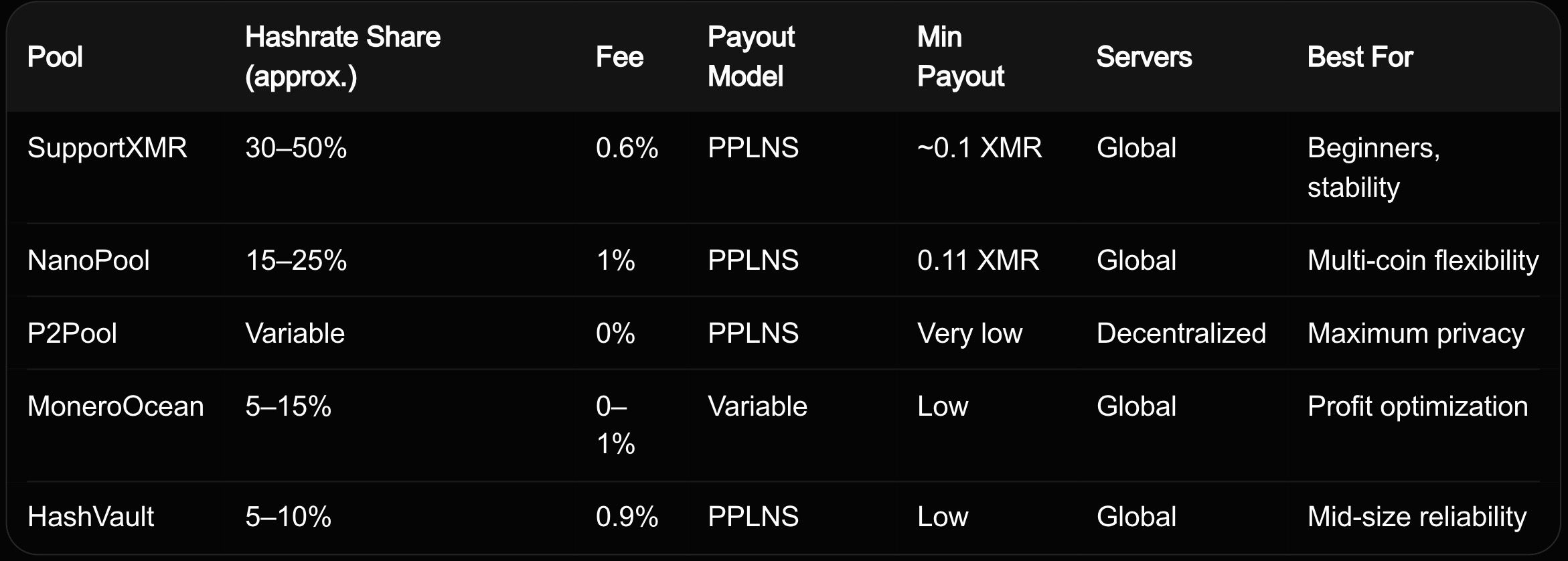 NanoPool offers Monero alongside several other coins, letting you switch easily or mine multiple assets. The 1% PPLNS fee is slightly higher, but the low minimum payout (0.11 XMR) and reliable global servers make it convenient. Liquidity and payout frequency are strong, and the user dashboard is straightforward. It works well for miners who want flexibility or test different coins. As explained in our monero-fcmp-plus-plus-upgrade-explained-xmr-users, multi-coin pools like NanoPool provide practical options in 2026.