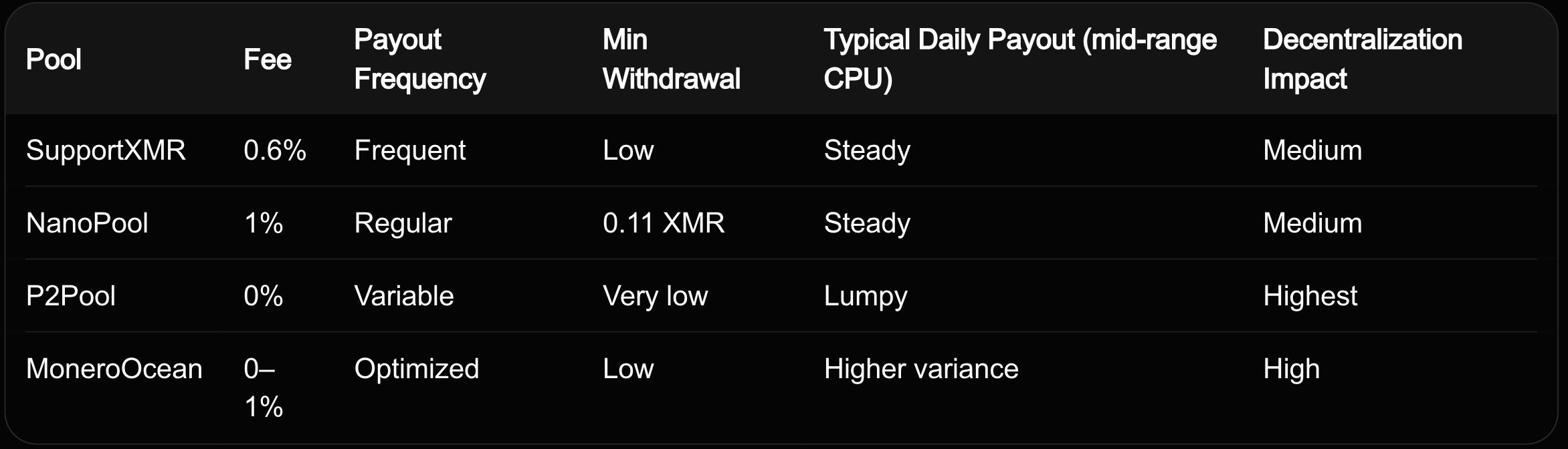 P2Pool is a decentralized, peer-to-peer pool with no central operator or fees (0%). Miners run a local node that connects directly to the Monero network, earning shares instantly via PPLNS with very low minimums. It maximizes privacy and network health by avoiding single points of failure. Setup requires more technical effort, and payouts can feel lumpier on smaller rigs. In 2026, it appeals to privacy advocates who want to support Monero’s ethos fully. As explained in our what-is-monero-xmr-2025-ultimate-privacy-coin-explained, P2Pool is the purest decentralized choice.