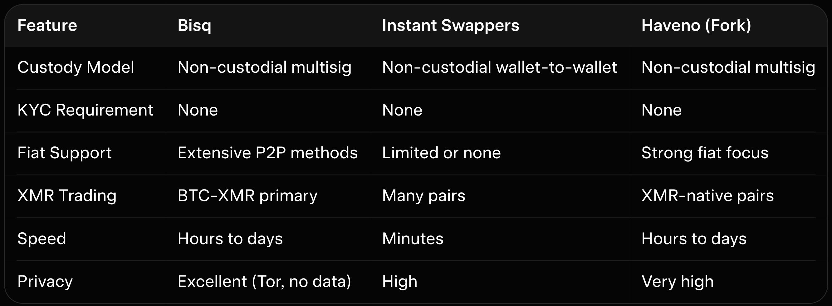 Haveno, a Bisq fork optimized for Monero, competes directly in the XMR space. It offers native Monero multisig advantages and potentially lower fees. Bisq retains broader liquidity and established user base for BTC-XMR routes.