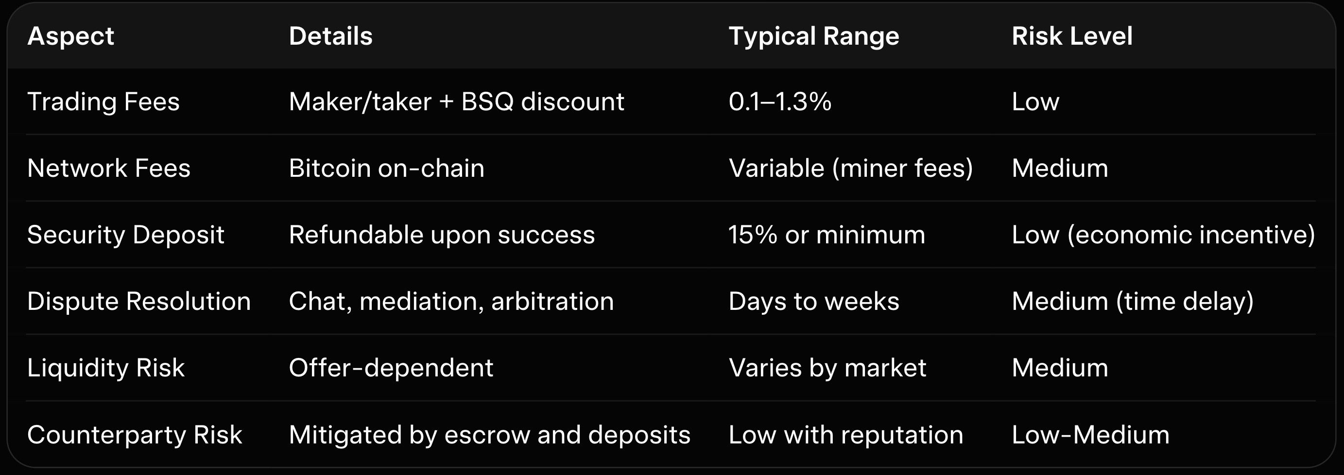 Trading fees stay low and transparent. Makers typically pay less than takers, with further discounts available when paying in BSQ tokens. Network mining fees for Bitcoin escrow transactions add to the total cost.