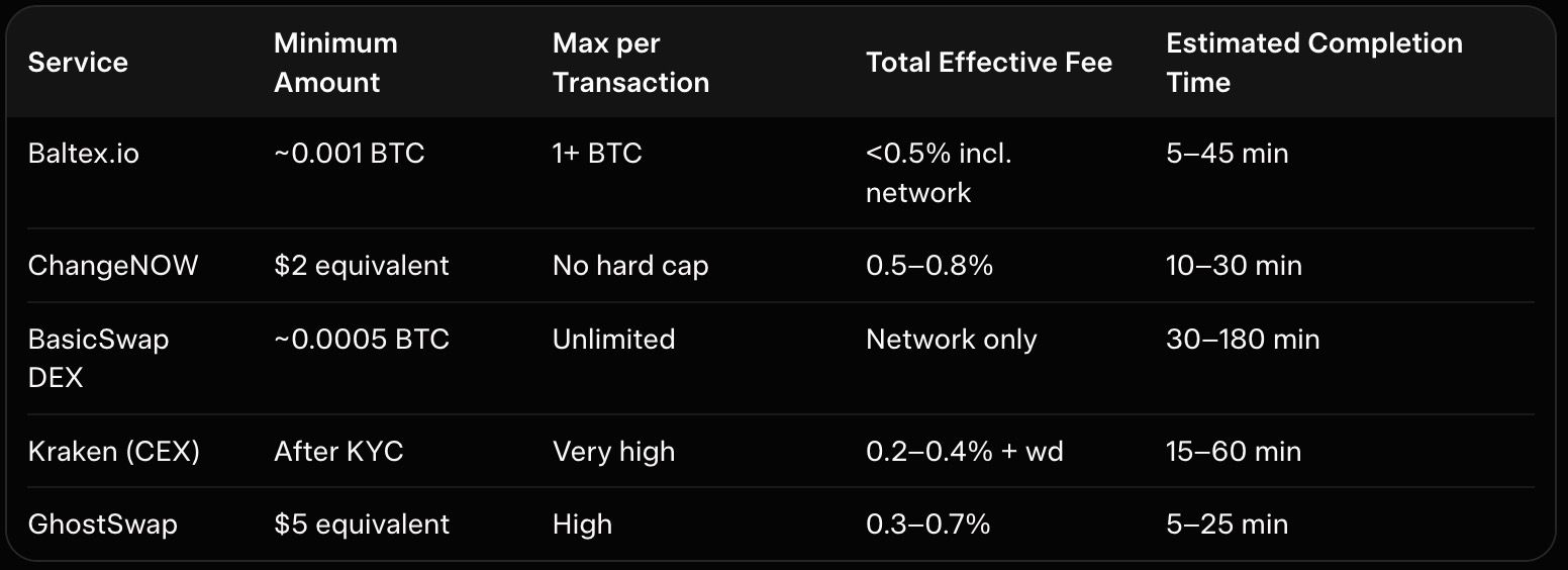 Can I swap large amounts without KYC? Yes—Baltex.io, GhostSwap, and similar non-custodial services support up to several BTC per transaction or unlimited via splitting, with no identity checks.