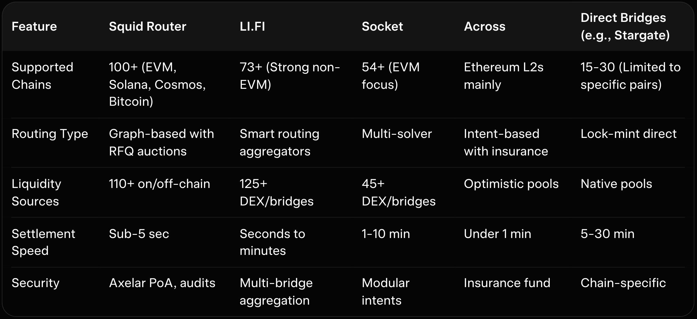 This table compares Squid to key rivals, showcasing its edge in chain breadth and speed.