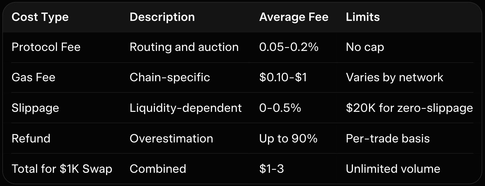 0.05-0.2% plus gas, with transparency and refunds for efficiency.