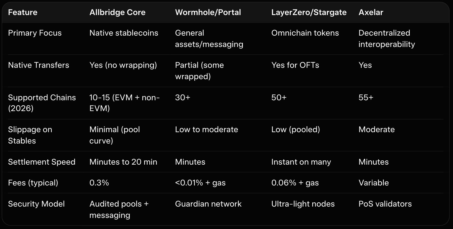 Wormhole (via Portal) supports 30+ chains with low fees (<$0.01) and fast settlements via guardians, but relies more on lock-and-mint for some assets, potentially adding steps for stables. LayerZero (powering Stargate) offers omnichain flexibility and instant finality on many routes, with strong stablecoin volume (often 60%+ market share), but general messaging can lead to variable slippage without dedicated pools. Axelar provides decentralized PoS security across 55+ ecosystems, excelling in institutional flows but with higher complexity for simple stable moves.