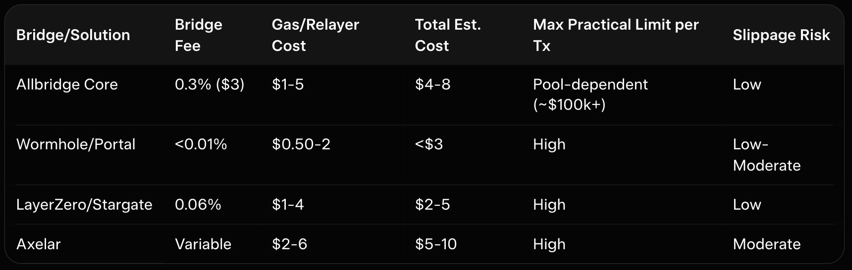 Table 2: Costs and Limits (Approximate for $1,000 USDC Transfer in 2026)