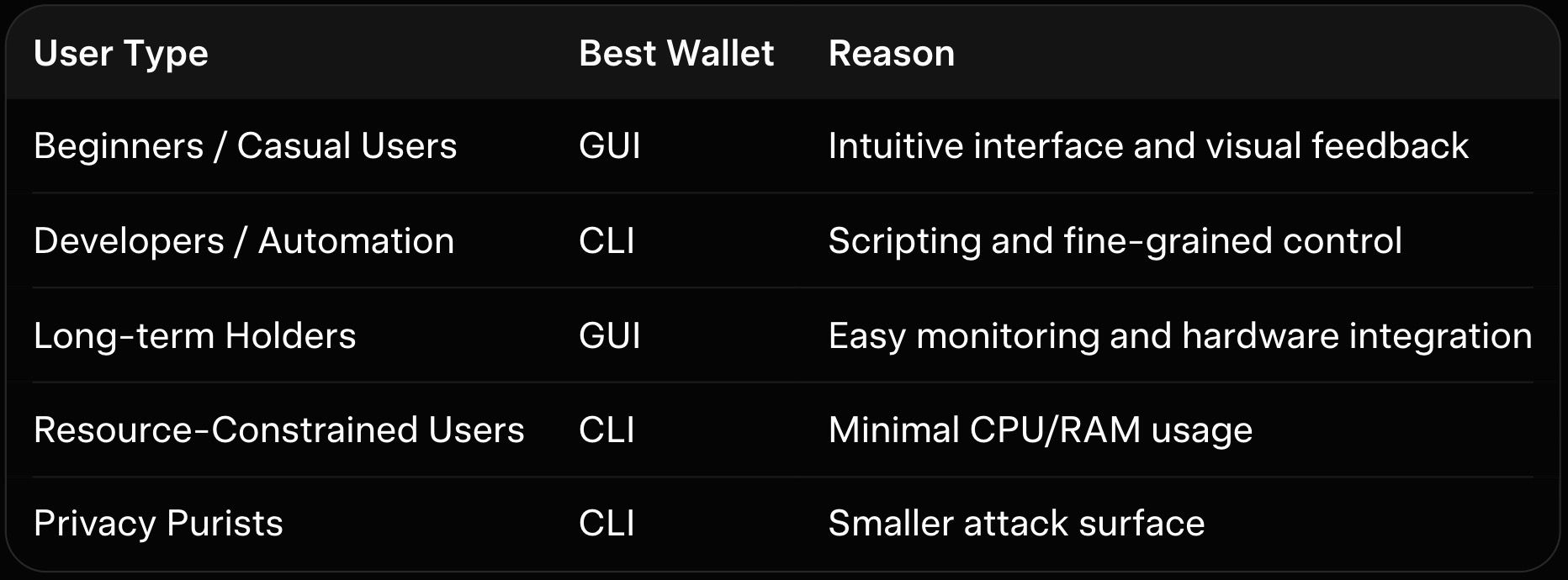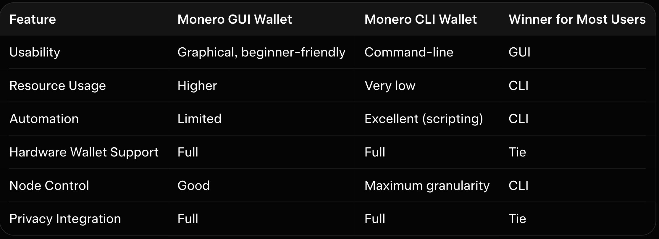 The GUI is best for beginners, long-term holders, and anyone who values ease of use. The CLI is best for developers, miners running background nodes, and users who need automation or run on limited hardware. As explained in our how-does-monero-xmr-work-privacy-features-explained-2025, choose the wallet that matches your technical comfort level.