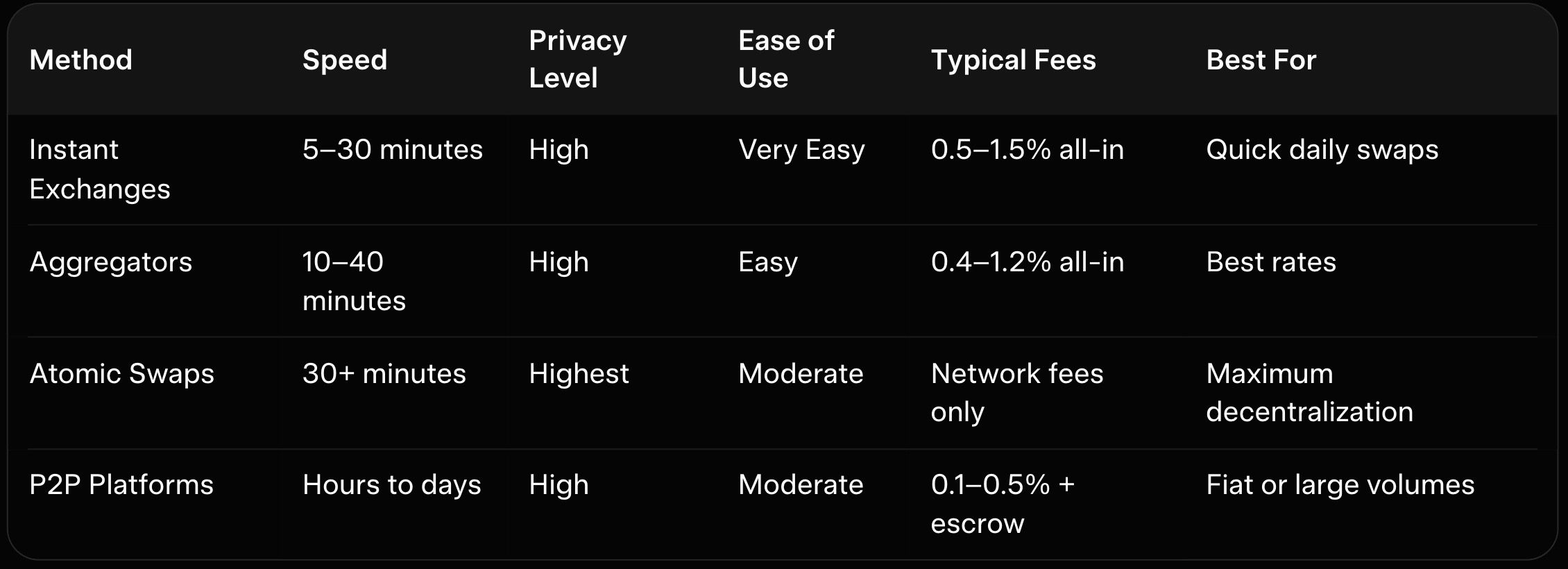 Instant exchanges like GhostSwap or Baltex.io typically complete in under 20 minutes with no KYC required. Aggregators add slight time but often deliver superior rates.