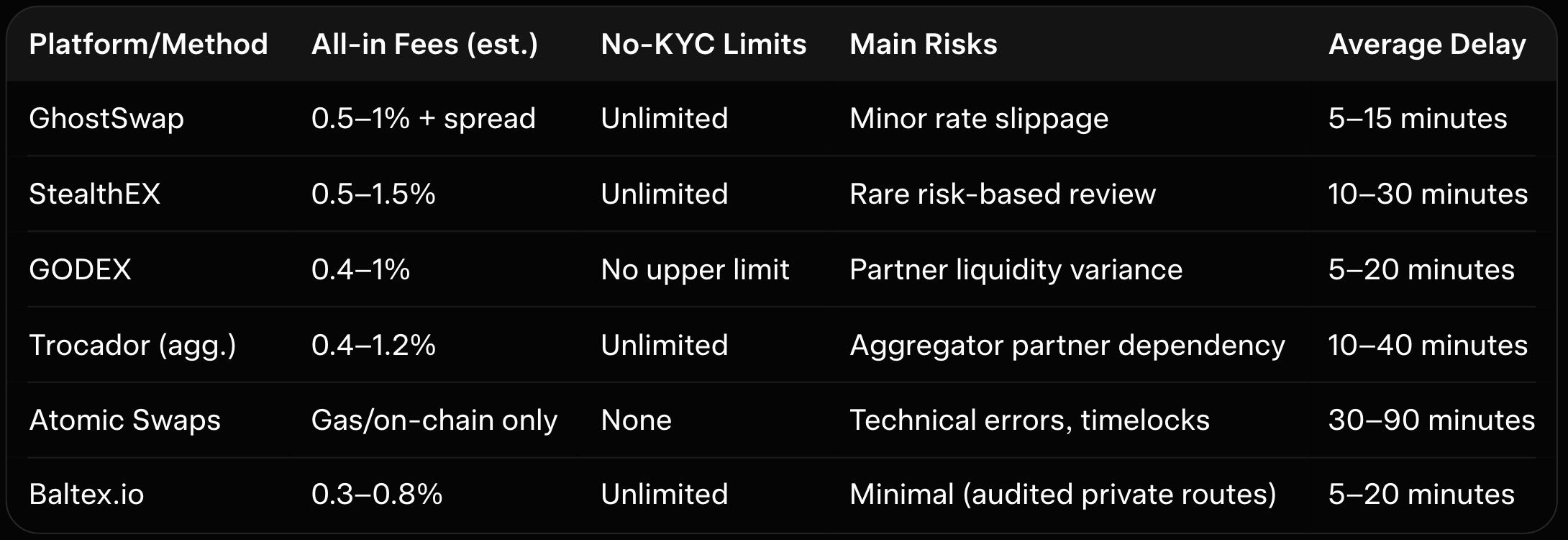 Even no-KYC platforms may apply risk-based checks on unusually large or patterned flows. Sudden policy changes have occurred on some services. Diversify across two or three providers to reduce exposure.