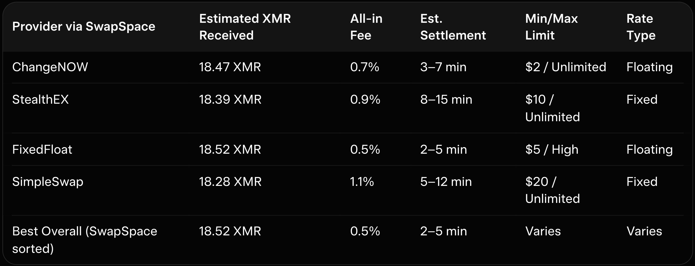 Here is a real-world rate comparison example for BTC to XMR (0.1 BTC input) on SwapSpace in 2026: