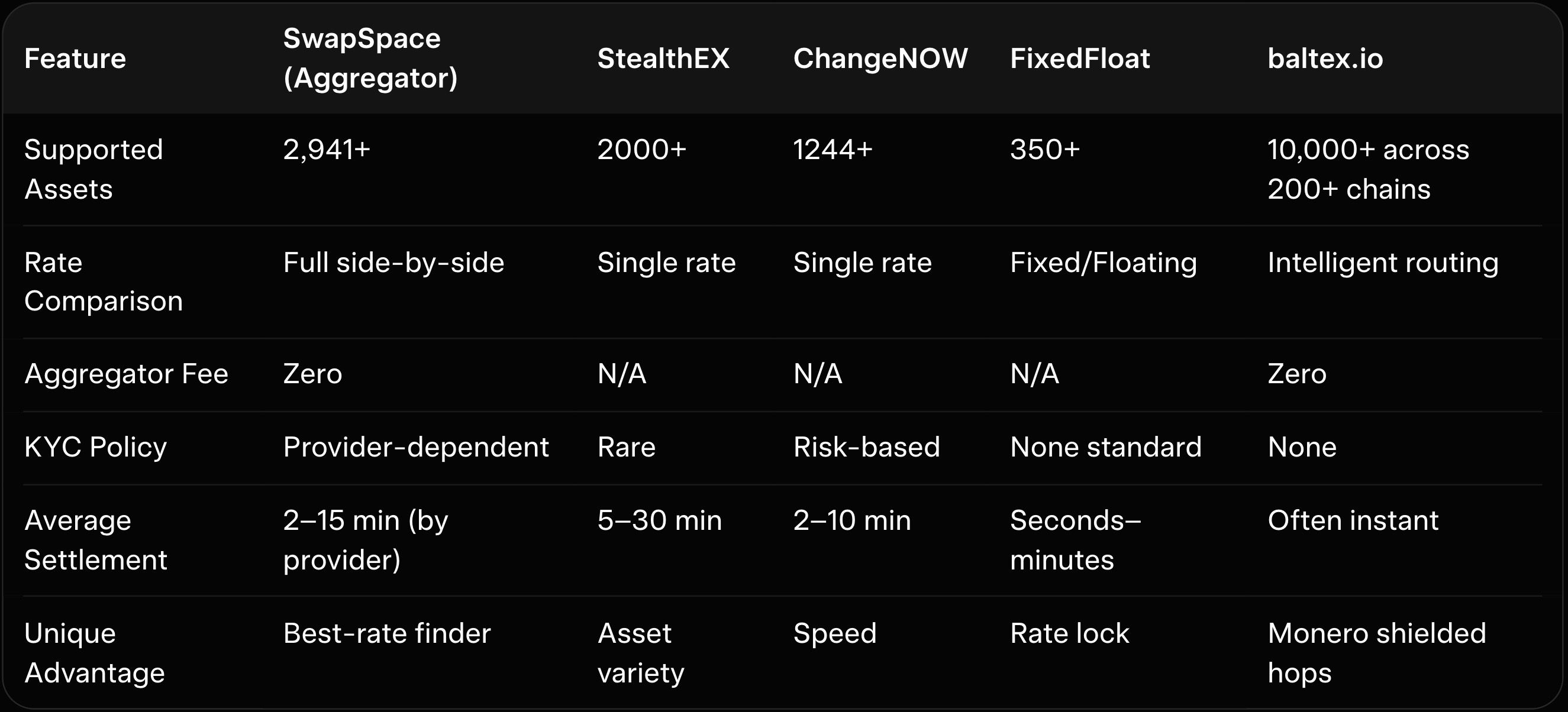 TLDR In 2026, SwapSpace serves as a powerful instant exchange rate aggregator that instantly compares live offers from 40+ providers across 2,941+ coins, including strong Monero (XMR) support, with zero extra aggregator fees and full transparency on rates, estimated times, and provider-specific limits. Users select any pair (e.g., BTC to XMR), view sorted offers from platforms like ChangeNOW, StealthEX, and FixedFloat, and complete the swap directly through the chosen provider—all without registration. Settlements mirror the selected partner (typically 2–15 minutes), while risk depends on the route chosen. Compared to single-platform services, SwapSpace consistently finds the best rate but adds one extra click. For true one-click multi-chain routing with built-in Monero privacy hops instead of routing through third-party exchangers, baltex.io delivers superior control—see our Baltex vs ChangeNOW: Better Rates 2026 for direct proof. Overall, SwapSpace is ideal when you want to compare rates across providers before swapping into or out of XMR—test with small amounts and combine with baltex.io for complex privacy needs.